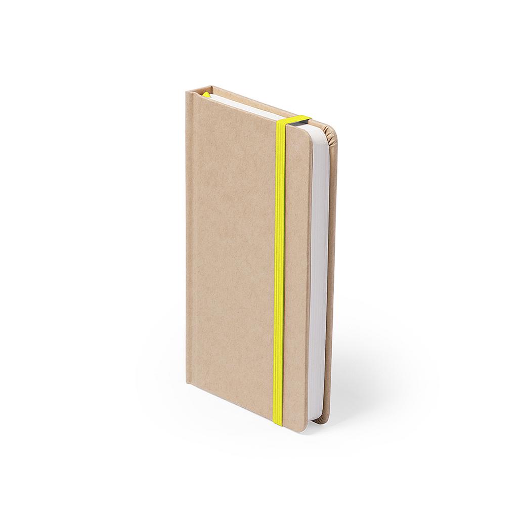 Bloc de notas con tapas de suave tacto acabadas en resistente cartón natural. De 100 hojas lisas, con elástico de sujeción y marcapáginas de tela a juego. 1 logotipo estampado en serigrafía a 1 color.