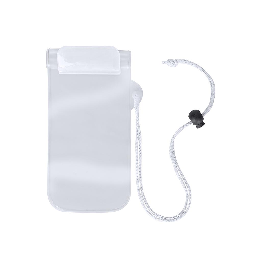 Prático portatodo impermeable en PVC con función táctil y doble sistema de seguridad para preservar la estanqueidad. Con zona de marcaje frontal a juego con el cordón de transporte -con accesorio de ajuste-.