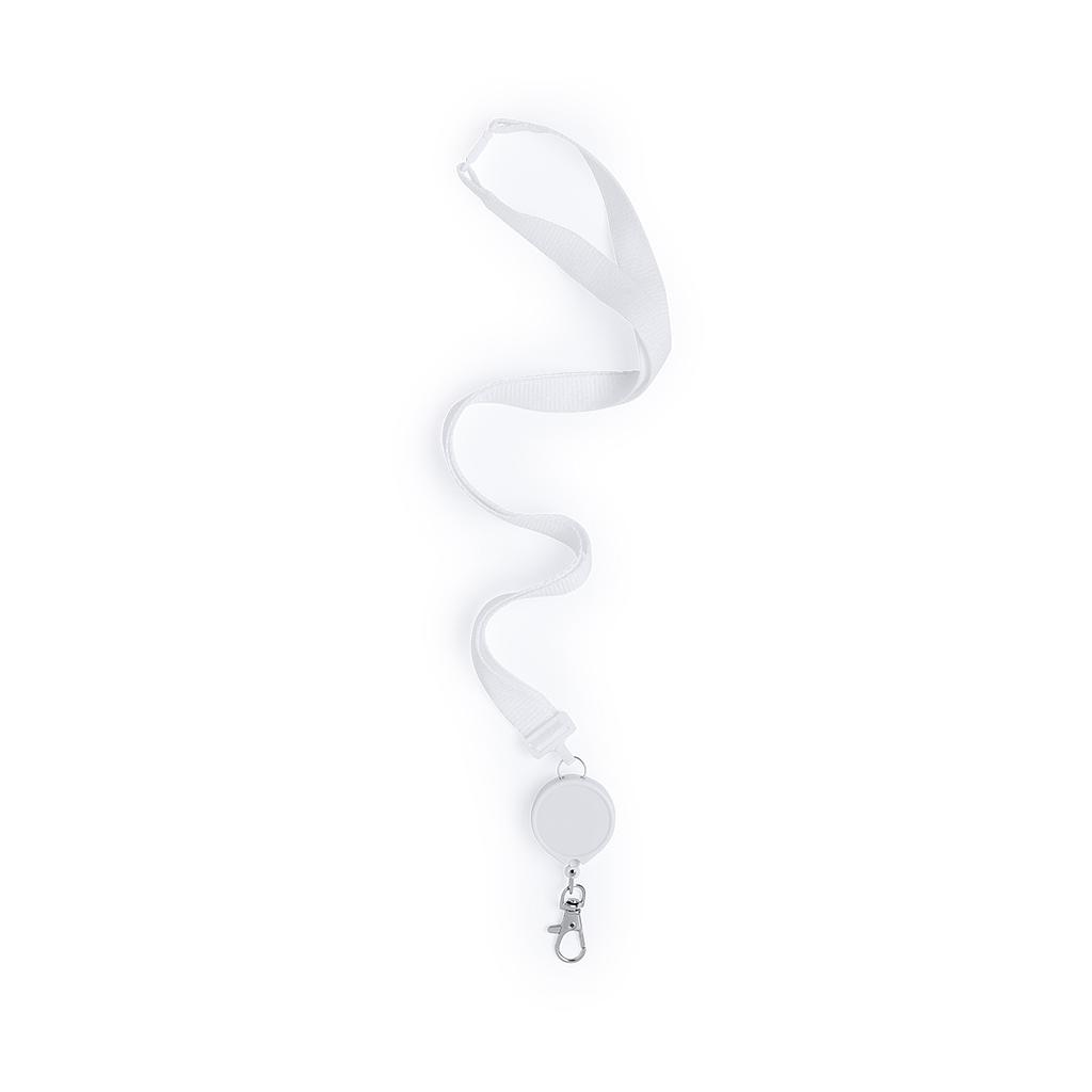 Práctico lanyard en poliéster con accesorio extensible. Accesorio de seguridad en el cuello y accesorio retráctil extensible con clip de ajuste en un lado, dejando el otro lado libre para el logotipado. Mosquetón metálico. Conjunto disponible en colores blanco y negro.