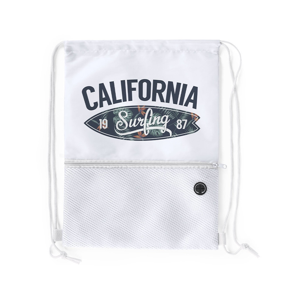 Gymbag de cuerdas en suave poliéster 210D, con bolsillo de acceso rápido y cierre de cremallera a juego, ideal para el transporte de accesorios y kits higiénicos. Disponible en extensa gama de colores, con salida de auriculares, cuerdas autocierre a juego y esquinas reforzadas, 1 logotipo estampado en serigrafía a 1 color.