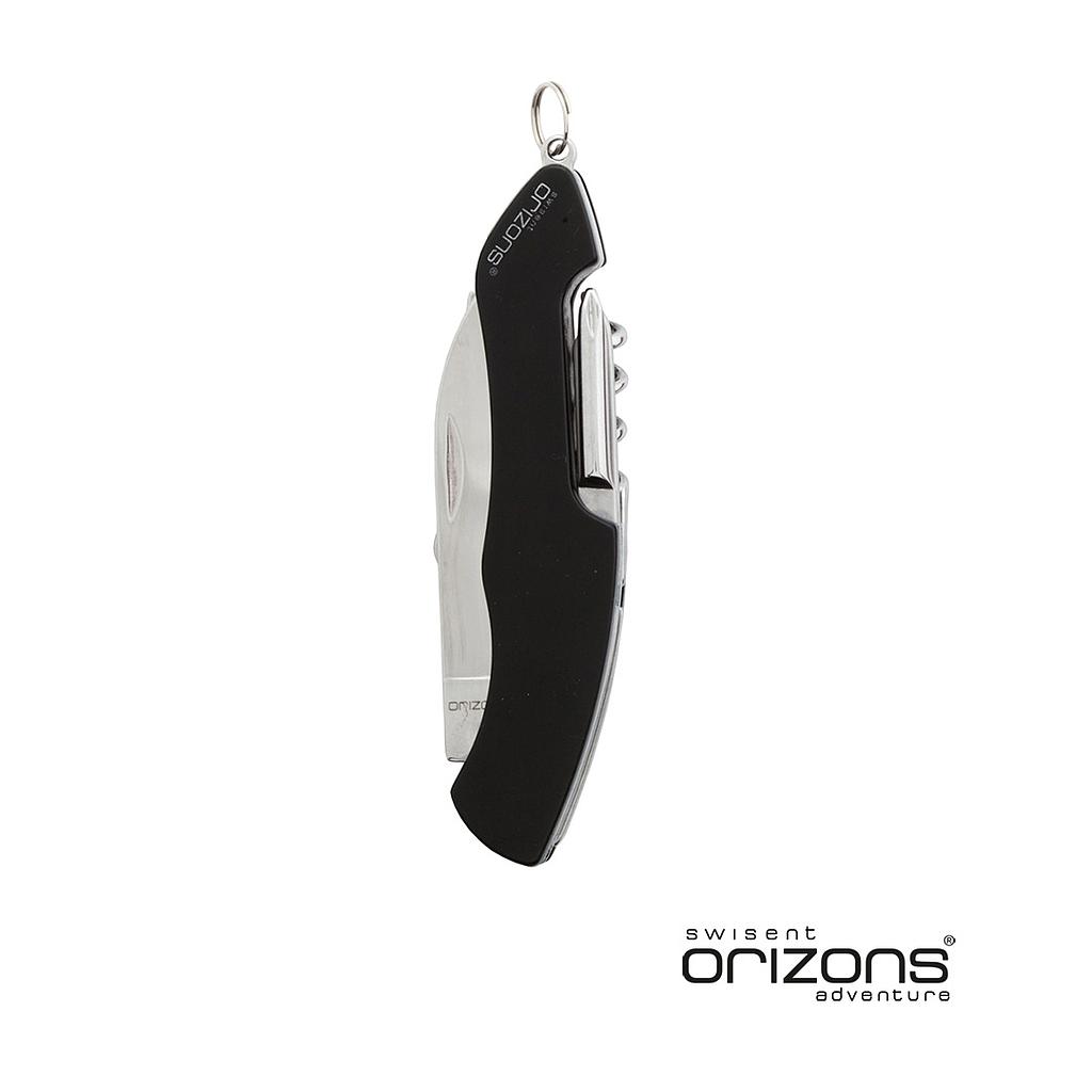 Navaja multiusos de orizons con accesorios de acero inox de 10 funciones y mango de aluminio en vivos colores. Con navaja, tijeras, abrelatas, abrebotellas con destornillador plano, destornillador de punta de estrella, punzón con lima y sacacorchos. Con anilla para llavero y presentada en atractiva caja de diseño con logotipo de la marca.