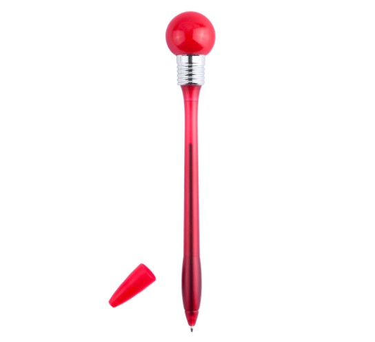 Divertido bolígrafo bombilla con cuerpo de suave acabado en vivos colores transparentes. Con linterna esférica de goma con luz a juego que se activa dejando caer el bolígrafo en una superficie dura. Capucha a juego y en tinta azul. NO incluye Baterías. Pedido Mínimo 100 unidades.