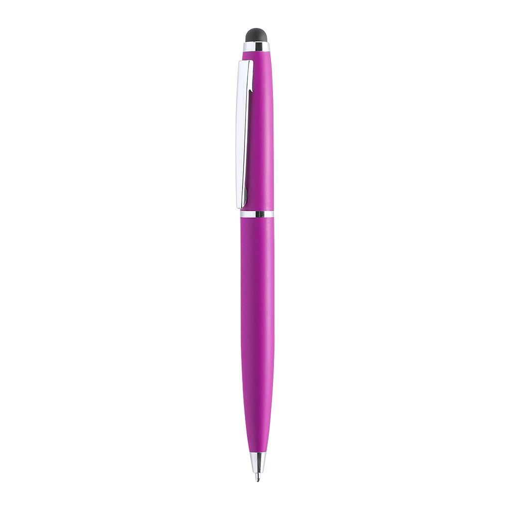 Bolígrafo puntero de mecanismo giratorio con cuerpo metálico de suave acabado en alegres colores. Accesorios y anillos en color plateado. Tinta azul.