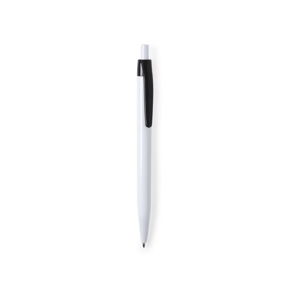 Bolígrafo de mecanismo pulsador en diseño bicolor. Con cuerpo en color blanco y clip en variada gama de colores. Amplia superficie de impresión y en tinta azul.