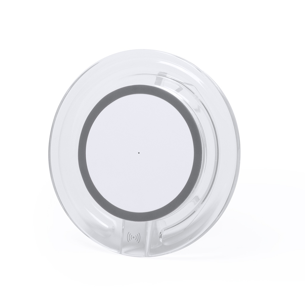 Cargador inalámbrico circular. Cuerpo transparente con detalle en variada gama de vivos colores. Con base antideslizante e indicador led de estado de carga. Compatible con dispositivos equipados con tecnología de carga inalámbrica y presentado en atractiva caja de diseño.