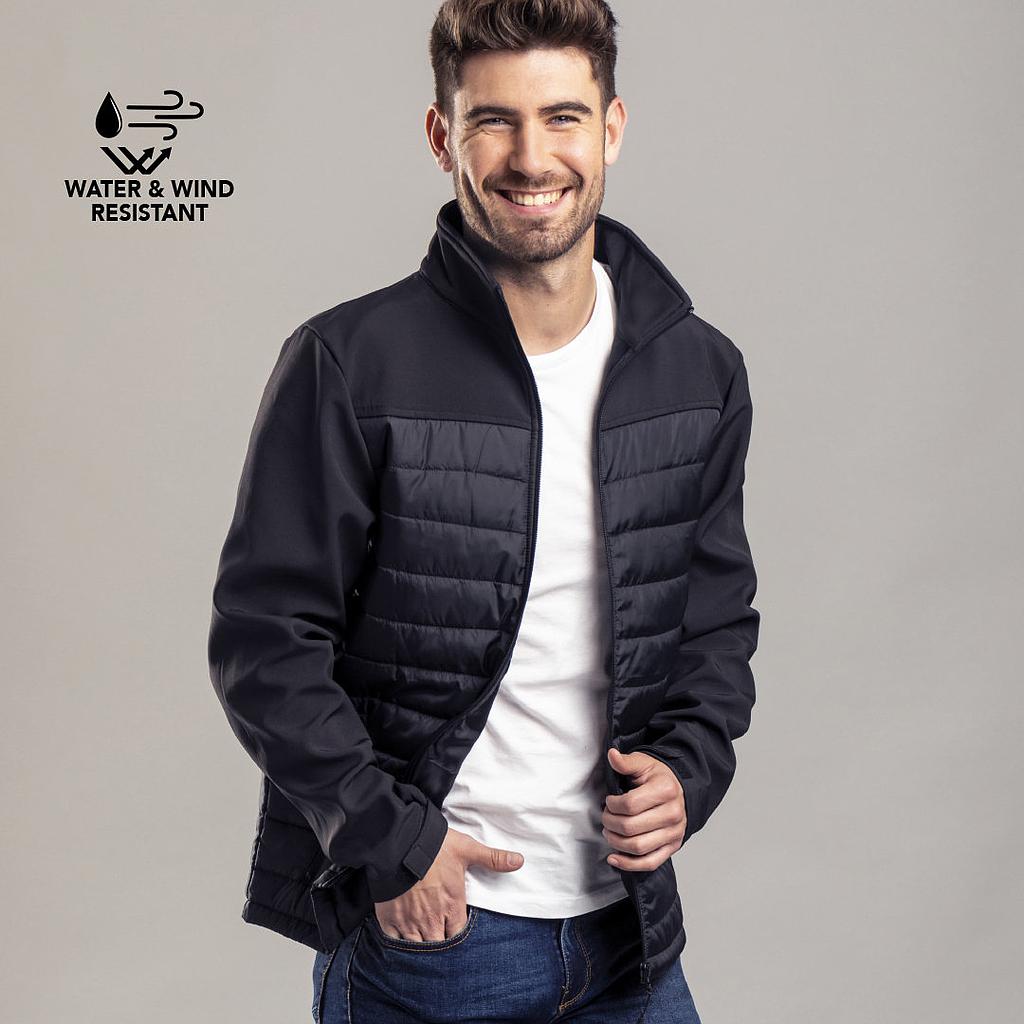 Chumpa impermeable y transpirable en combinación de materiales soft shell y poliéster. De elegante construcción en color negro, con cierre de cremallera y bolsillos laterales de cremallera con tiradores para fácil apertura. Puños ajustables y disponible en tallas S, M, L, XL.