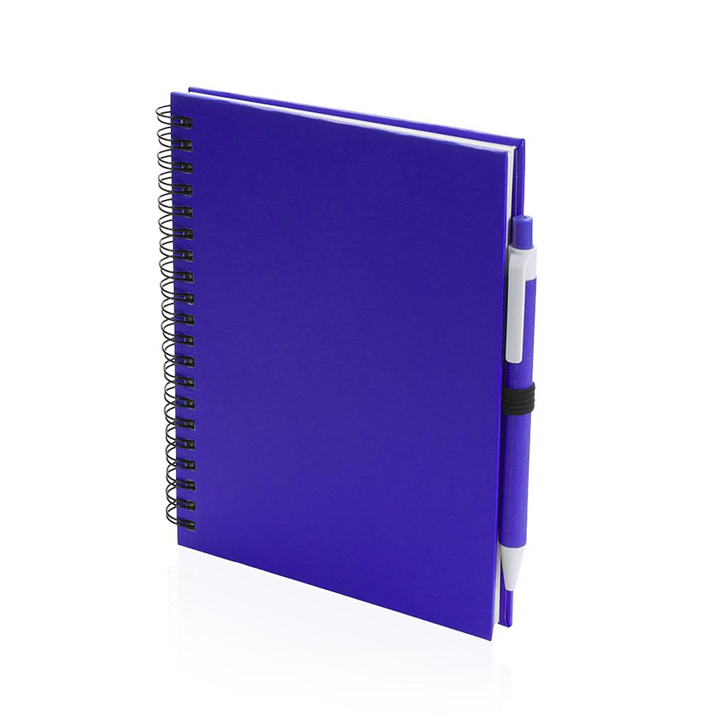 Libreta anillada con portada y contraportada de suave al tacto en resistente cartón reciclado y bolígrafo en cartón reciclado a juego incluido. 70 hojas lisas y con soporte para bolígrafo en contraportada. 1 logotipo estampado en serigrafía a 1 color en la portada.