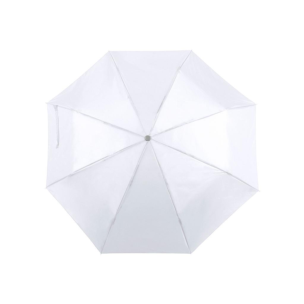 Paraguas plegable de 8 paneles de poliéster 170T en extensa gama de vivos colores y 96cm de diámetro. De apertura manual, con varillas metálicas en color plateado, cierre de velcro y cinta de transporte en mango ergonómico. Presentado en funda individual a juego.