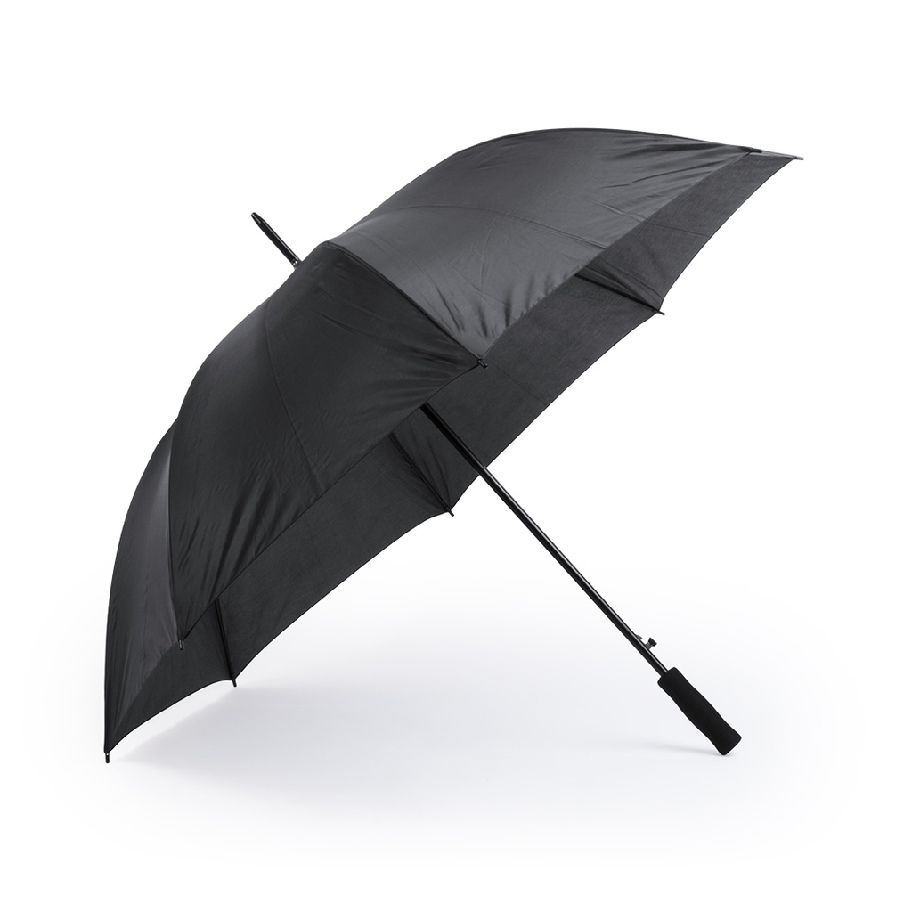 Sombrilla de 8 paneles tamaño XL -130cm diámetro- con sistema antiviento. Apertura automática, en resistente poliéster y con varillas de fibra en color negro. Con mango acolchado de EVA y cierre de velcro, 1 logotipo estampado en serigrafía a 1 color en 1 panel.