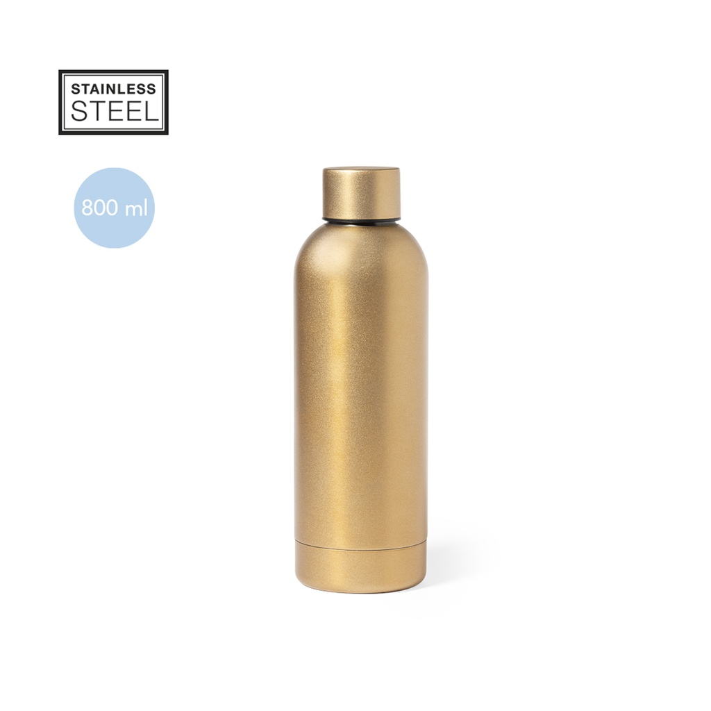 Squeeze de acero inox de 800 ml de capacidad, disponible en variada gama de colores metalizados de acabado mate. Presentado en atractiva caja de diseño. 1 logotipo estampado en serigrafía a 1 color. Pedido Mínimo: 100 unidades.