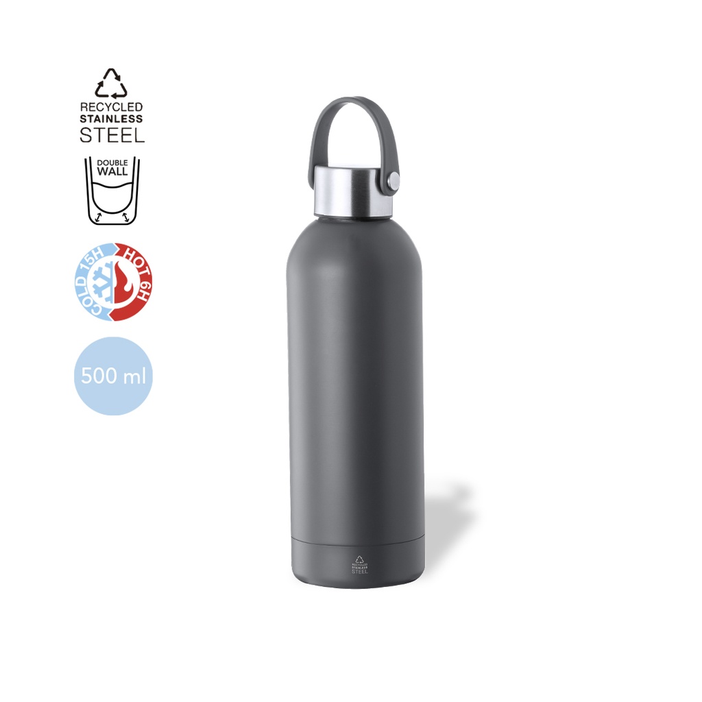 Squeeze térmico de 500 ml de capacidad, fabricado en acero inox reciclado de doble pared, con tapón a rosca en mate y asa integrada a juego. Disponible en variada gama de colores satinados, libre de BPA y presentado en caja individual de diseño kraft. 1 logotipo estampado en serigrafía a 1 color.