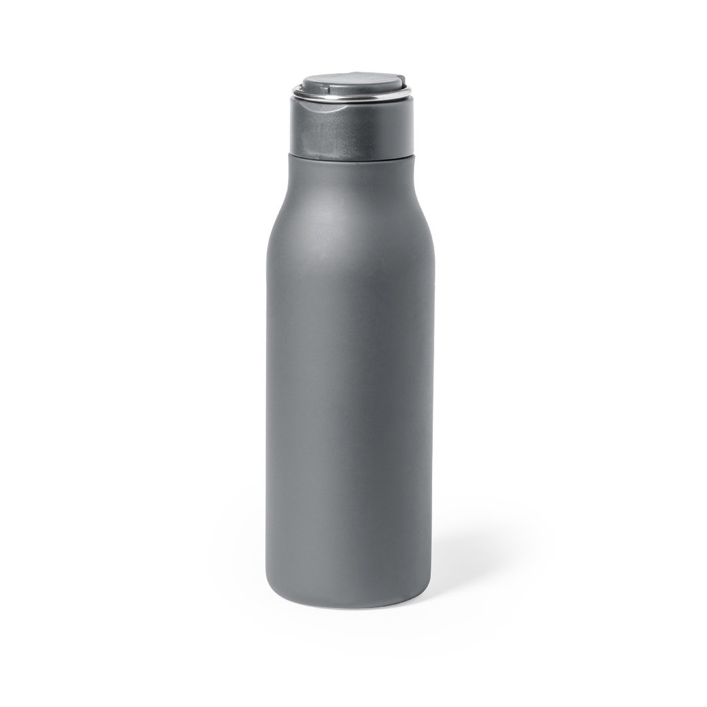 Bidón de 600 ml de capacidad, fabricado en acero inox. Tapón a rosca a juego libre de BPA, con anilla de transporte integrada, plegable y de acabado cromado. Disponible en variada gama de colores satinados y presentado en caja individual de diseño kraft. 1 logotipo estampado en serigrafía a 1 color.