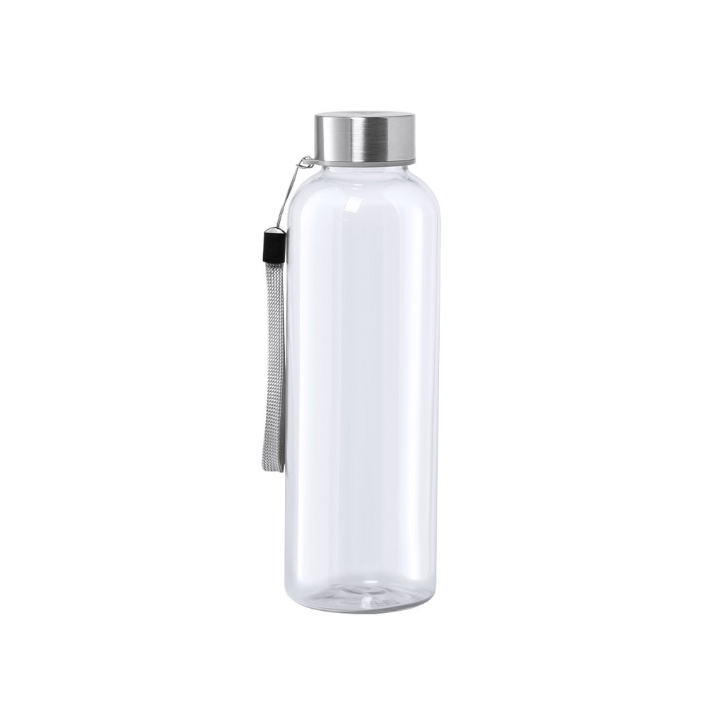 Bidón de 600ml de capacidad. Libre de BPA, con cuerpo de RPET elaborado a partir de plástico reciclado para así fomentar la reutilización de residuos plásticos y contribuir a la sostenibilidad del planeta. Tapón a rosca en acero inox, con cordón de transporte. Disponible en variada gama de colores.