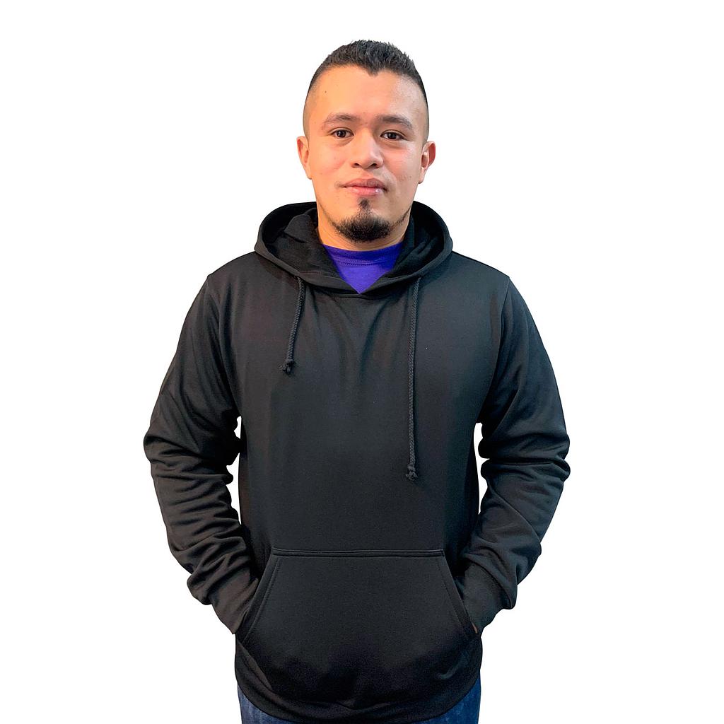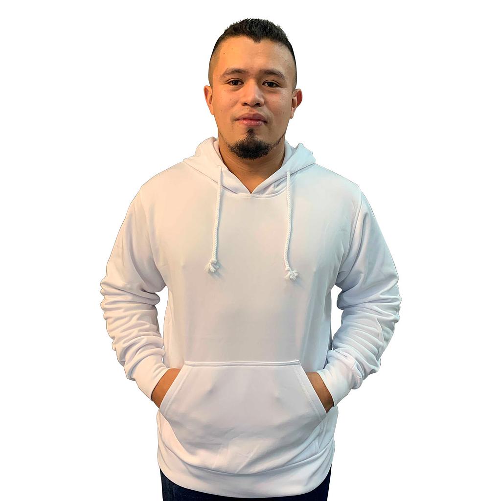 Hoodie (Sudadera) para adulto unisex. Con capucha, cintas de ajuste, bolsa frontal, en material 100% poliéster de 265g/m2. Ideal para personalizar con bordado, serigrafía o vinil textil. Color blanco ideal para sublimar.